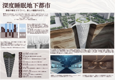 都市のレイヤー構造を再解釈し、都市空間における「動」と「静」を再定義する地下型の睡眠施設を提案したものです。