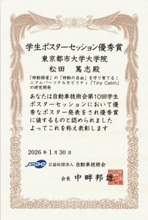 この度、西山研の博士後期課程社会人大学院生の松田篤志さんが、公益社団法人自動車技術会2025年秋季大会学生ポスターセッションで、優秀賞を授与されました。