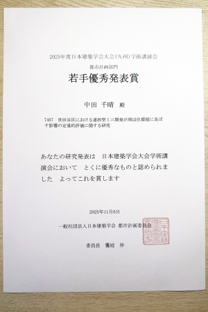 2025年9月に九州大学で行われた日本建築学会大会学術講演会において,環境プランニング研究室(斉藤圭教授)修士課程1年の中田千晴さんが,「世田谷区における連担型ミニ開発が周辺住環境に及ぼす影響の定量的評価に関する研究」をテーマとした研究成果を発表し,都市計画部門での若手優秀発表賞を受賞しました。