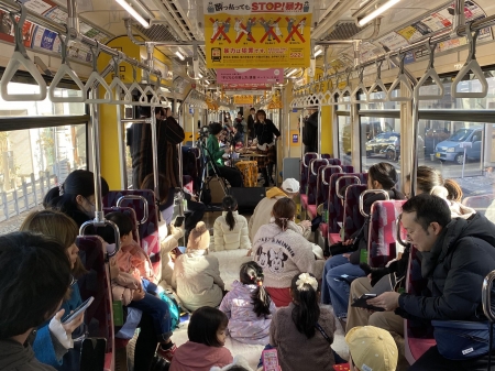 電車は三軒茶屋と下高井戸を往復40分で走り、子どもがよく知っている曲の演奏、歌の披露を行い